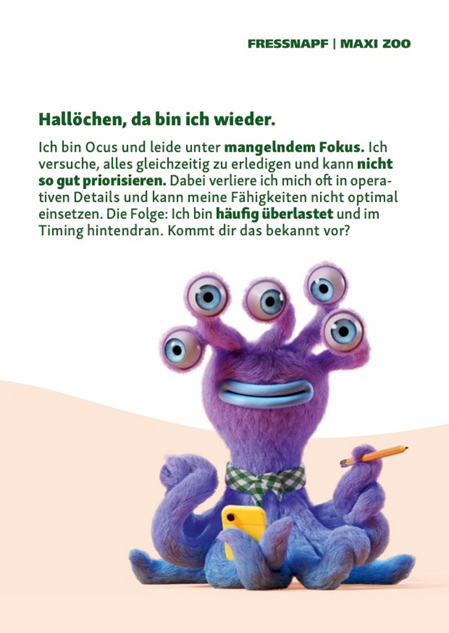 Welches Großunternehmen kennt sie nicht: Arbeits- und Verhaltensweisen, die eine effektive, effiziente und motivierende Zusammenarbeit torpedieren. Fressnapf hat diese Energieräuber 2023 nicht nur identifiziert und definiert – sondern auch gemeinsam mit BUTTER.PEOPLE und den Genies von Foreal personifiziert. Entstanden sind sechs knuffige Monster, die auf unterhaltsam-kreative Art und Weise in der internen Kommunikation eingesetzt werden, um Themen wie Ineffizienz, Intransparenz und Veränderungsresistenz aktiv anzugehen.