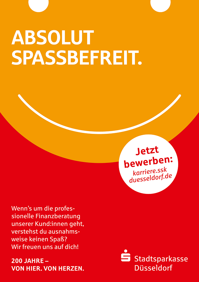 Die neue EVP der Stadtsparkasse Düsseldorf lautet “Aus Freude an der Verantwortung”. Und die spürt man in jedem einzelnen Asset. Einerseits durch die kreative und spielerische Umsetzung. Andererseits auf Textebene, wo die Rolle der Stadtsparkasse als Partner der Region und als moderne Filialbank deutlich wird. Wer also Spaß am Job und Einfluss auf die Region haben will: it´s a match.