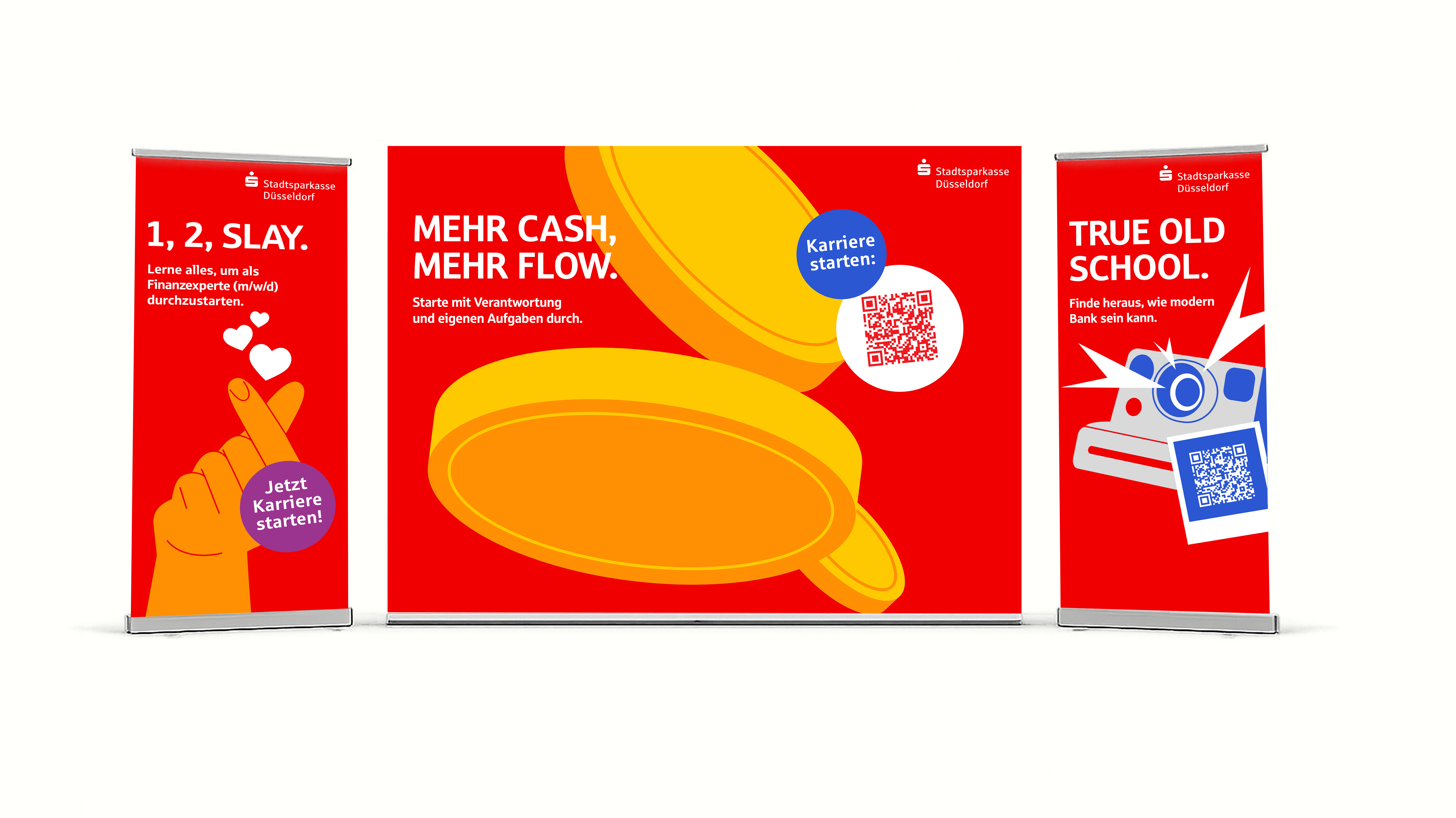 Wir haben für die Stadtsparkasse Düsseldorf die neue Arbeitgeberkommunikation kreiert. Was für eine schöne Aufgabe. Denn das Image der Sparkassen ist zwar etwas angestaubt. Aber die Lust, auf Zukunft und Veränderung bei unserem Kunden riesig groß. Und daher war der Auftrag eindeutig: "Macht uns eine Kampagne, die OHNE Menschen arbeitet." Zumindest OOH, in digitalen Assets und bei Print. Haben wir gemacht. Für den Großraum Düsseldorf und die digitale Welt. Mit dem größten Vergnügen.
